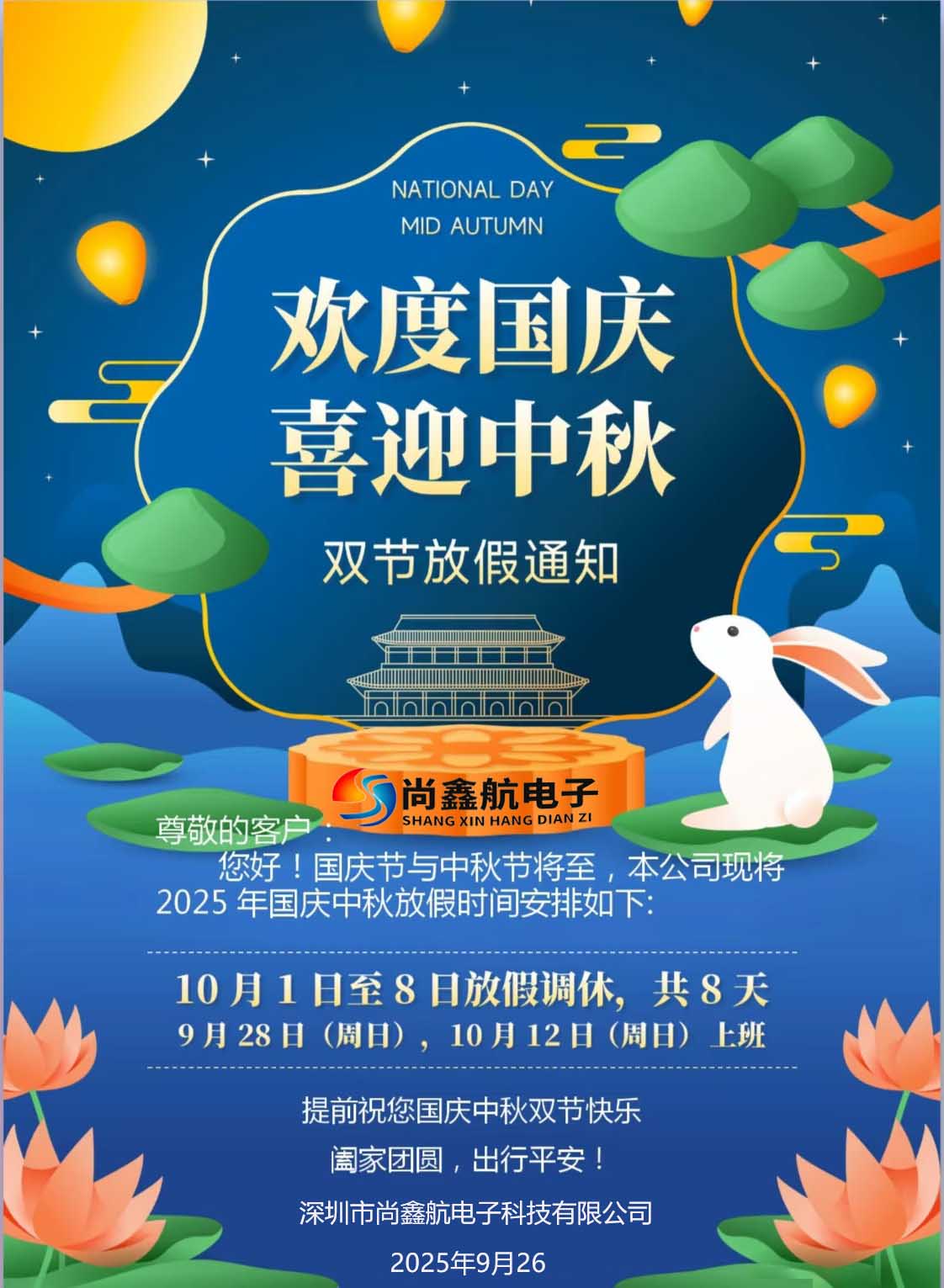 关于2025年本公司国庆节的放假安排如下